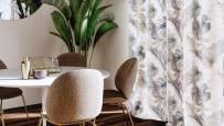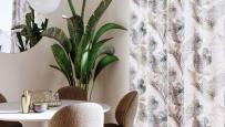 Getty è uno stampato in misto lino, 70%PL 30%LI, con sfondo chiaro e in contrasto troviamo grandi foglie e palme tropicali, nei colori verdi, tortora e blu. In altezza 295/300 cm finito piombo.-