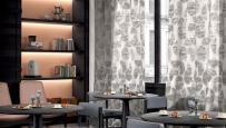 Metal (88% LI 12% PL) colpisce per la sua particolare stampa su lino. Con fondo proposto nelle varianti naturale, tortora e grigio e grandi bolle a contrasto, Metal è disponibile in altezza 295/300 cm.