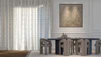 Oscar è un tendaggio realizzato con un particolare ricamo effetto rilievo che crea un gioco di lucido e opaco, in composizione 100% PL.